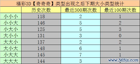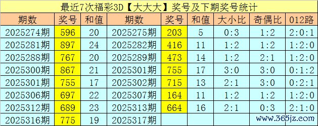 一、福彩3D上期奖号为775,大小类型开出:大大大,历史上该大小类型奖号共出现1095次,最近7次【大大大】奖号差别开出:596、897、767、867、755、697、689,其中组三号码出现2次,组六号码出现5次。